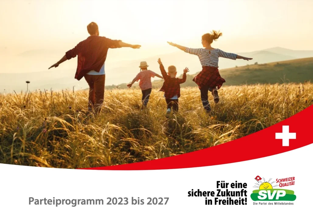 Das Parteiprogramm 2023-2027 der Schweizerischen Volkspartei steht unter dem Titel «Für eine sichere Zukunft in Freiheit!» und dokumentiert die politischen Standpunkte und Forderungen der SVP. Im Parteiprogramm finden Sie die Positionen zu allen wichtigen Themen der eidgenössischen Politik.